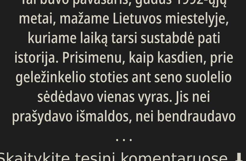 Tai buvo pavasaris, gūdūs 1992-ųjų metai, mažame Lietuvos miestelyje, kuriame laiką tarsi sustabdė pati istorija. Prisimenu, kaip kasdien, prie geležinkelio stoties ant seno suolelio sėdėdavo vienas vyras. Jis nei prašydavo išmaldos, nei bendraudavo su praeiviais. Tiesiog sėdėjo su namine drobine taše prie kojų, žiūrėdamas į besidriekiantį bėgių tinklą, lyg bandytų įžvelgti ten prasmę.