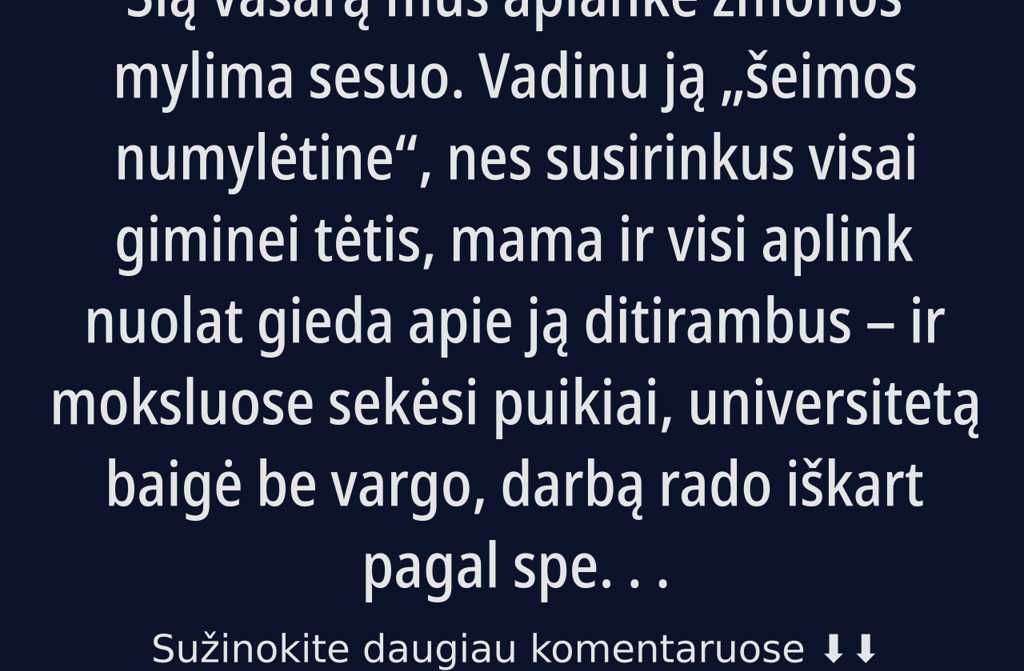 Tuo tarpu mano žmona, vyresnioji sesė, net universiteto taip ir nebaigė, o ir ištekėjo jauna. Tačiau giminaičiams tai visai nerūpėjo juk aš pats buvau finansiškai stiprus: nuosavas butas Vilniuje, automobilis, nebloga įmonė. Deja, net ir tokiu atveju, didžiausiu pasididžiavimu vis tiek išliko jaunesnioji žmonos sesuo.