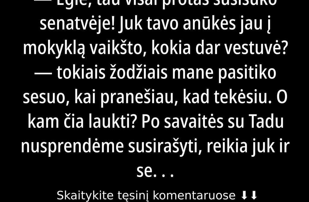 Egle, tau visai protas susisuko senatvėje! Juk tavo anūkės jau į mokyklą vaikšto, kokia dar vestuvė? tokiais žodžiais mane pasitiko sesuo, kai pranešiau, kad tekėsiu.