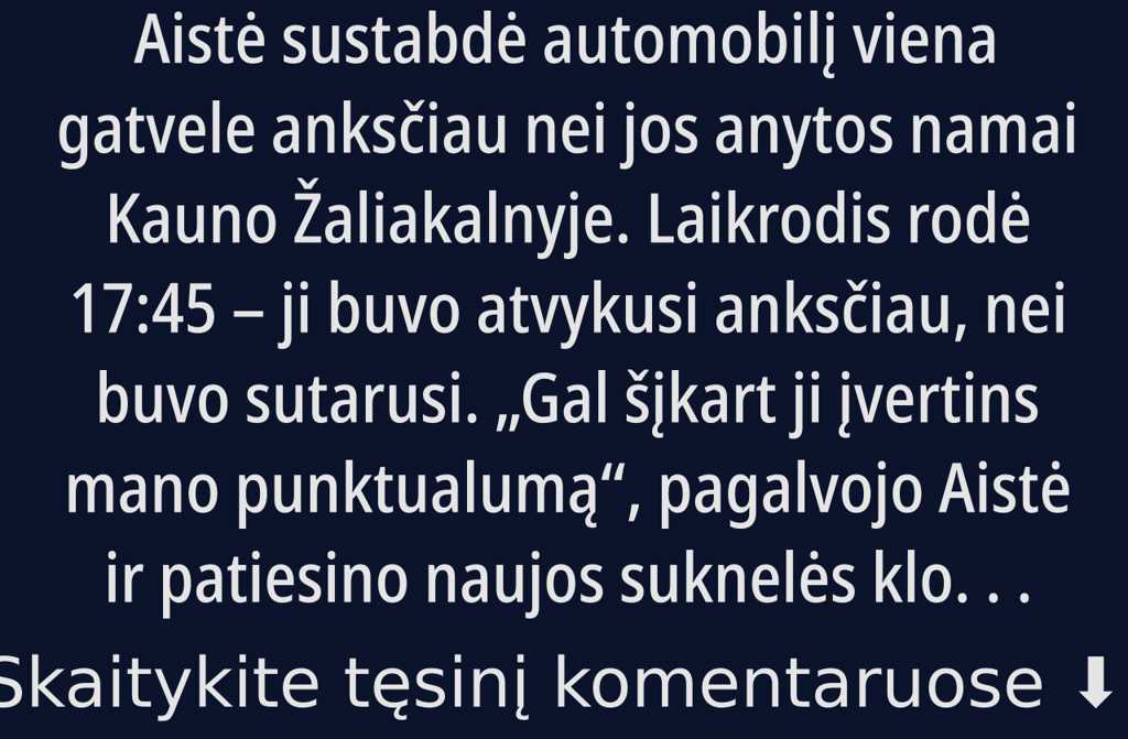 Aistė sustabdė automobilį viena gatvele anksčiau nei jos anytos namai Kauno Žaliakalnyje. Laikrodis rodė 17:45 ji buvo atvykusi anksčiau, nei buvo sutarusi. Gal šįkart ji įvertins mano punktualumą, pagalvojo Aistė ir patiesino naujos suknelės klostes. Dovanų senovinė segė, kurios ji ieškojo kelis mėnesius tarp kolekcininkų Vilniuje ir Kaune gulėjo kruopščiai suvyniota ant galinės sėdynės.