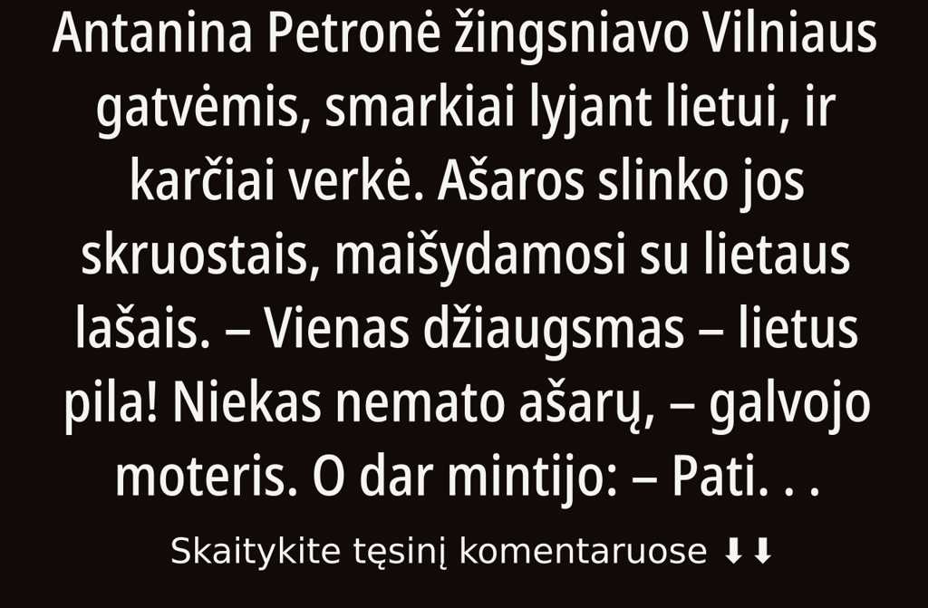 Antanina Petronė žingsniavo Vilniaus gatvėmis, smarkiai lyjant lietui, ir karčiai verkė. Ašaros slinko jos skruostais, maišydamosi su lietaus lašais.