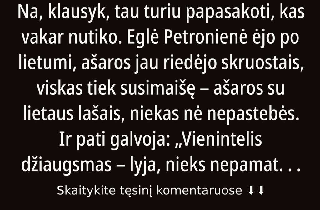 Na, klausyk, tau turiu papasakoti, kas vakar nutiko. Eglė Petronienė ėjo po lietumi, ašaros jau riedėjo skruostais, viskas tiek susimaišę ašaros su lietaus lašais, niekas nė nepastebės. Ir pati galvoja: Vienintelis džiaugsmas lyja, nieks nepamatys, kaip verkiu. O dar prisiminė: pati kalta užėjau ne laiku, kaip nekviesta viešnia.