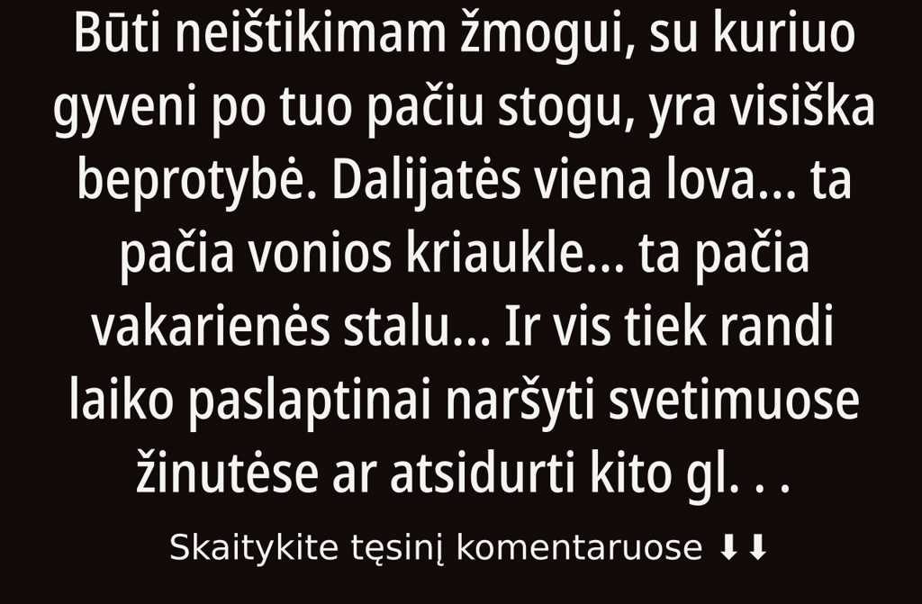 Būti neištikimam žmogui, su kuriuo gyveni po tuo pačiu stogu, yra visiška beprotybė. Dalijatės viena lova… ta pačia vonios kriaukle… ta pačia vakarienės stalu… Ir vis tiek randi laiko paslaptinai naršyti svetimuose žinutėse ar atsidurti kito glėbyje, o paskui viską nuslėpęs grįžti po tais pačiais patalais, kurie dar kvepia tuo, kuris tavimi pasitiki labiausiai. Tai nėra vien tik išdavystė… tai šaltas apskaičiuotas nepagarbos veiksmas.