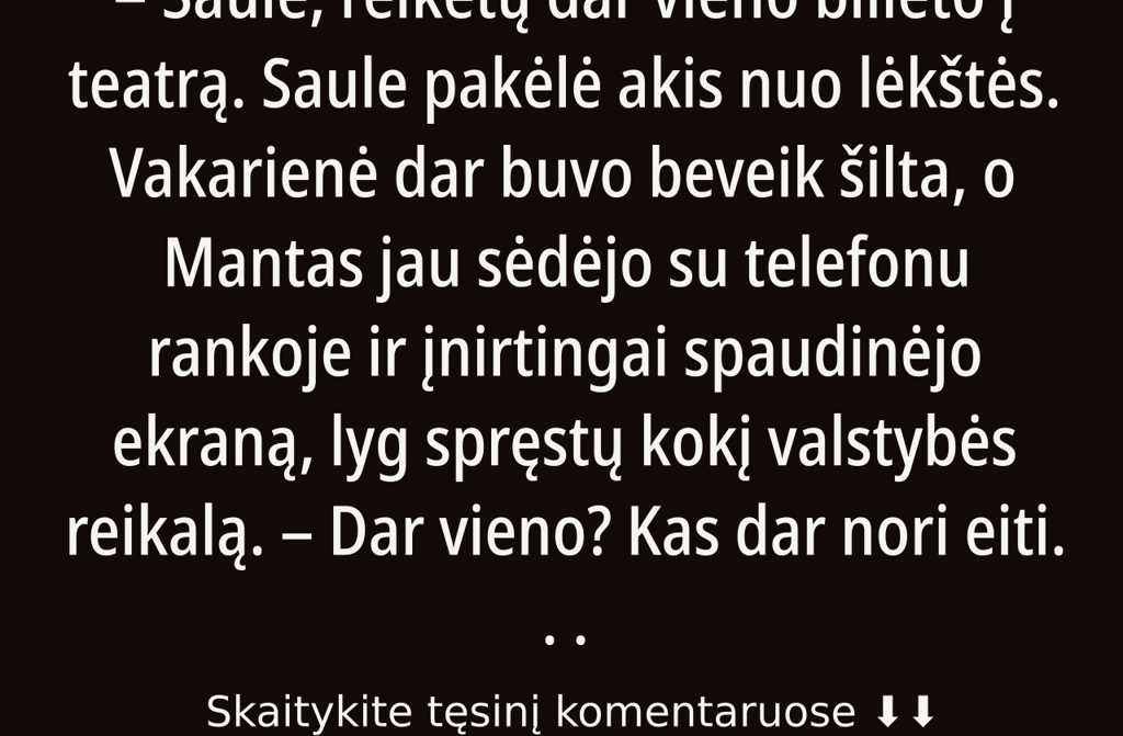 Saule pakėlė akis nuo lėkštės. Vakarienė dar buvo beveik šilta, o Mantas jau sėdėjo su telefonu rankoje ir įnirtingai spaudinėjo ekraną, lyg spręstų kokį valstybės reikalą.