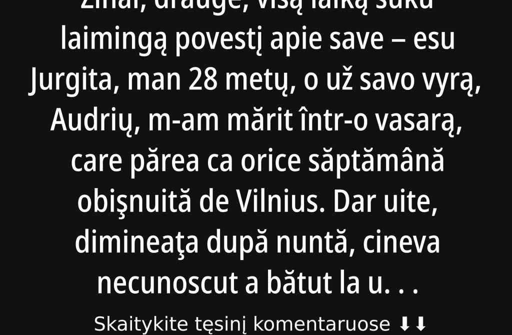 Žinai, drauge, visą laiką suku laimingą povestį apie save esu Jurgita, man 28 metų, o už savo vyrą, Audrių, m-am mărit într-o vasarą, care părea ca orice săptămână obişnuită de Vilnius. Dar uite, dimineaţa după nuntă, cineva necunoscut a bătut la uşa noastră. Mi-a spus că există ceva despre Audrių, ce nu ştiam şi nici n-aş fi ghicit.