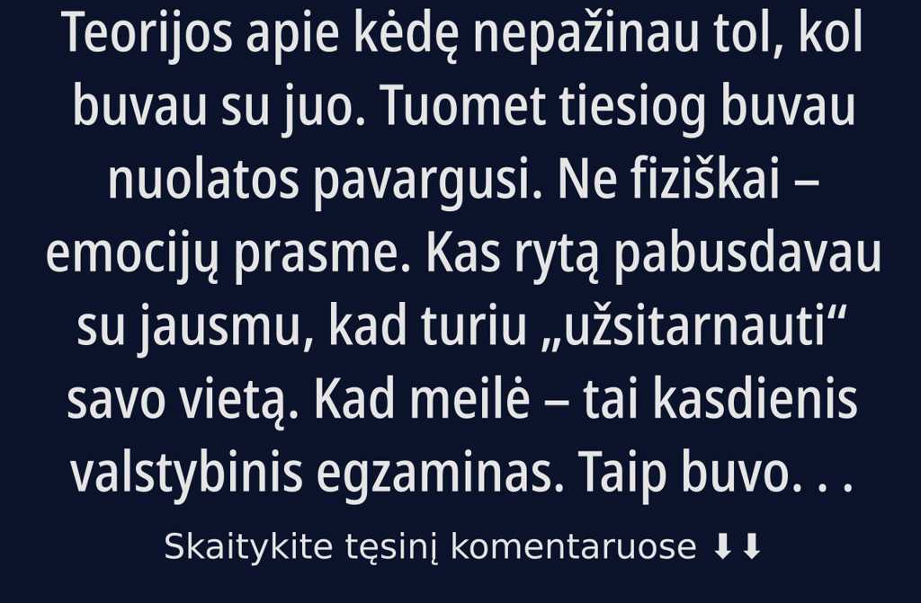 Peržiūrėjau savo santykius kaip filmą. Visi momentai, kai norėjau dėmesio. Visi kartai, kai laukiau žinutės. Visi kartai, kai tylėjau, kad niekam nebūčiau nepatogi.