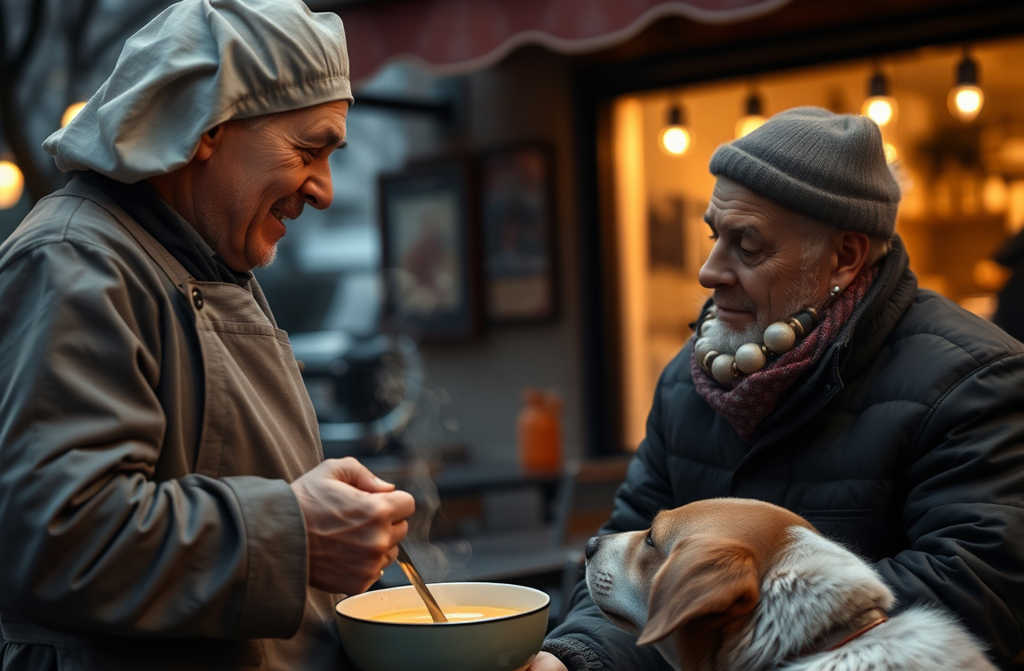 Kai ištiesiau vyrui dubenėlį, jis pakėlė į mane akis tiek nuovargio, bet kartu ir dėkingumo jo žvilgsnyje neatsimenu matęs niekur kitur. Labai jums ačiū, tyliai pasakė, dvi dienas burnoje neturėjau ką dėti. Šuo tyliai vizgino uodegą, lyg irgi dėkodamas. Vyras valgė lėtai, atsargiai, tarsi bijodamas, kad sriuba tuoj prapuls. Man stebint juodu, kažkaip pasidarė jaukiau ir šilčiau širdyje.