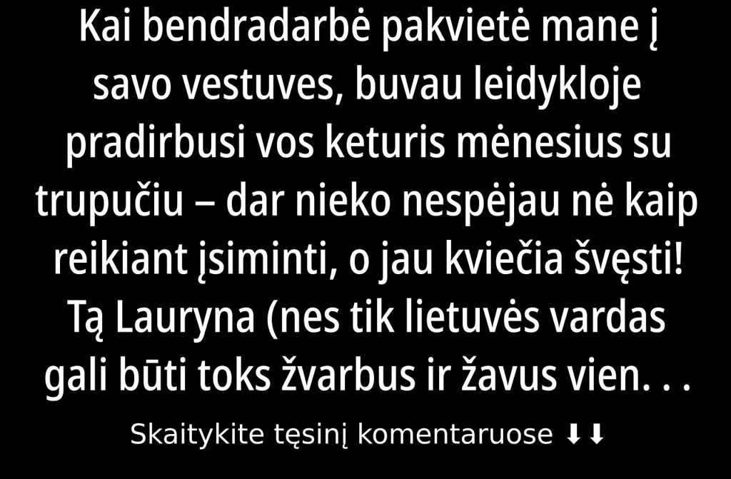 Po keleto mėnesių susituokėme patys ir nusipirkome kuklų butą Užupyje. Kartu esame jau nuo seno trys metai kaip viena diena! Aišku, leidykloje ilgai nestovėjau išėjau švilpdama, nes ten likęs buvusios žmonos liūdesys sklandė ore. Mane kolegos, be abejo, apšnekėjo nuo kaimynų iki kiemo šuns, juk Lauryna ten dirbo daug metų, o aš buvau tik šviežia bulvė. Visų gaila būta jos, visi šnekėjo, kiek tik burna neša.