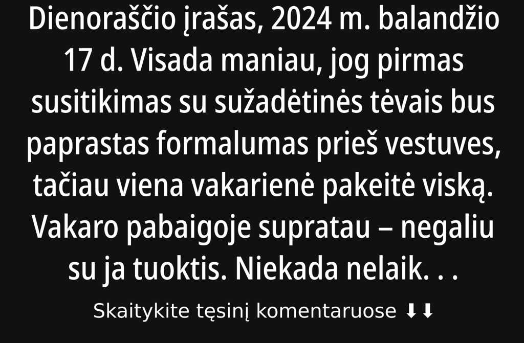 Visada maniau, jog pirmas susitikimas su sužadėtinės tėvais bus paprastas formalumas prieš vestuves, tačiau viena vakarienė pakeitė viską. Vakaro pabaigoje supratau negaliu su ja tuoktis.