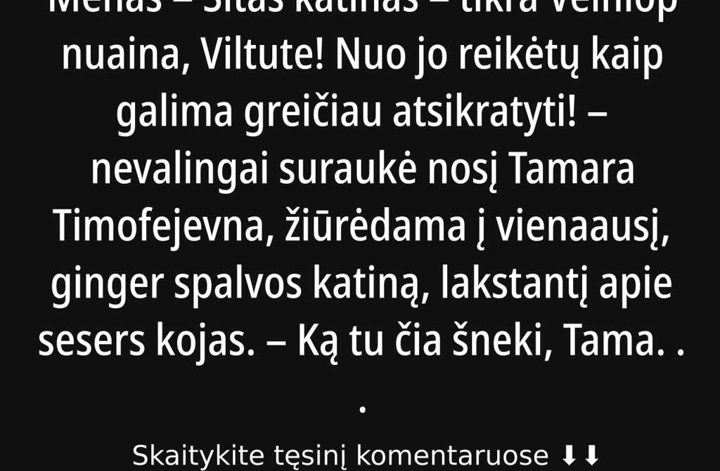 Viltutė atsargiai šyptelėjo ir stebėjo, kaip Tamaros veide vis labiau tirpsta rūstumas vietoj jo atsiranda kažkas naujo, šilta, beveik vaikiška viltis. Trumpą akimirką abi pajuto tokį pilnatvės gumulėlį krūtinėse, kad netikėtai švystelėjo viskas bus gerai.