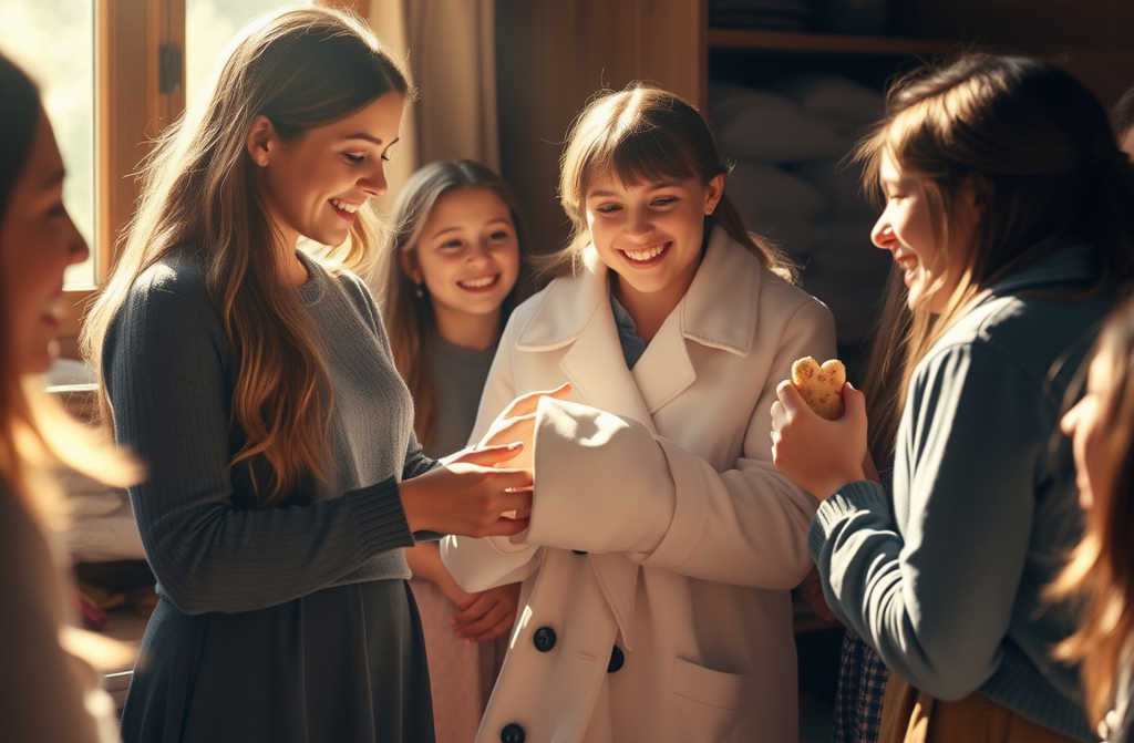 Taip paltas keliavo per kambariokes iš vienos rankų į kitas, apsilankė dešimtyje glėbių, įsismelkė kitų merginų kvepalais, obuoliais, karamelėmis. Kiekviena mergaitė gabijo grąžino mažą dovanėlę šokoladą, obuolių sultis, saują riešutų. Nors Gabija sakėsi nenorinti, vakare jos spintelėje buvo tikras lietuviškas vaišių stalas.