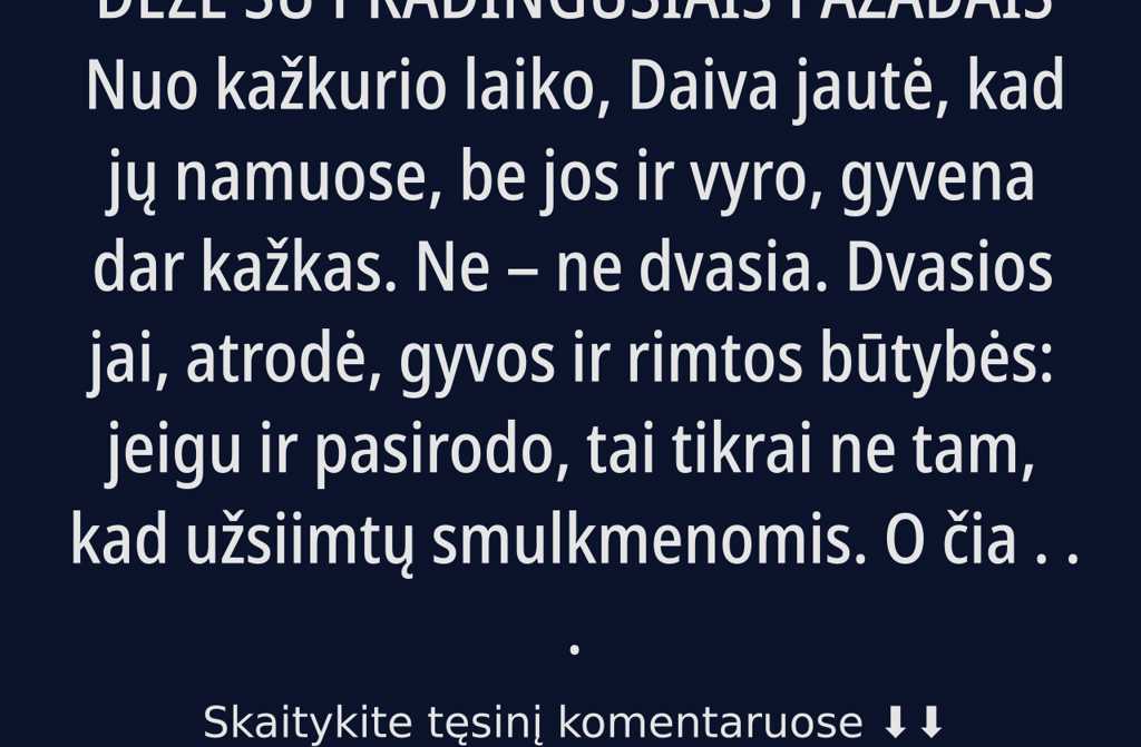 Nuo kažkurio laiko, Daiva jautė, kad jų namuose, be jos ir vyro, gyvena dar kažkas. Ne ne dvasia. Dvasios jai, atrodė, gyvos ir rimtos būtybės: jeigu ir pasirodo, tai tikrai ne tam, kad užsiimtų smulkmenomis.