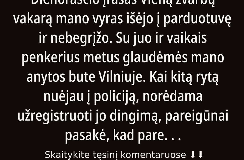 Vieną žvarbų vakarą mano vyras išėjo į parduotuvę ir nebegrįžo. Su juo ir vaikais penkerius metus glaudėmės mano anytos bute Vilniuje. Kai kitą rytą nuėjau į policiją, norėdama užregistruoti jo dingimą, pareigūnai pasakė, kad pareiškimą priims tik po trijų parų. Parašiau tą pareiškimą…
