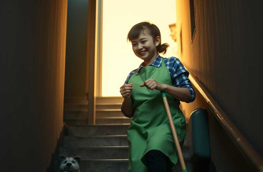 Po mokyklos ji paėmė berniuko ranką ir kartu ėjome į blokus, kuriuos prižiūrėjo. Vienoje rankoje Austėja laikė mopą, kitoje Domanto šiltas pirštas. Berniukas jau pažino ritmą: ji nuvalo turėklus, o jis atveria pašto dėžutes ir švelniai uždaro jas, lyg knygas, laukiančias perskaitymo. Kai pavargęs, jis sėsdavo ant laiptų ir garsiai skaitė iš mėgstamos knygos. Jo žodžiai pripildė laiptų namą paprasta, švari muzika.
