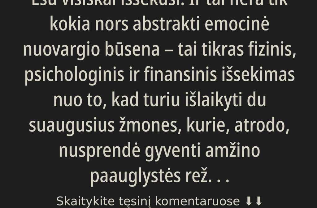 Esu visiškai išsekusi. Ir tai nėra tik kokia nors abstrakti emocinė nuovargio būsena tai tikras fizinis, psichologinis ir finansinis išsekimas nuo to, kad turiu išlaikyti du suaugusius žmones, kurie, atrodo, nusprendė gyventi amžino paauglystės režimu. Abu gerokai virš dvidešimt, sveikata puiki, visi naujausi telefonų modeliai, vardinės drabužių etiketės, šaldytuvas pilnas paruošto maisto, o namuose kaip penkių žvaigždučių viešbutyje. Jie keliasi tik vidurdieniais ar net vėliau, nužingsniuoja į virtuvę pasižiūrėti, ką valgys, ir jei ko nors neįtinka susiraukia ar pavarto akis. Nebando pasidomėti, kiek kas kainuoja. Nei padėkos žodžio, nei bent menkiausios pagalbos užtat reikalavimų kiek nori.