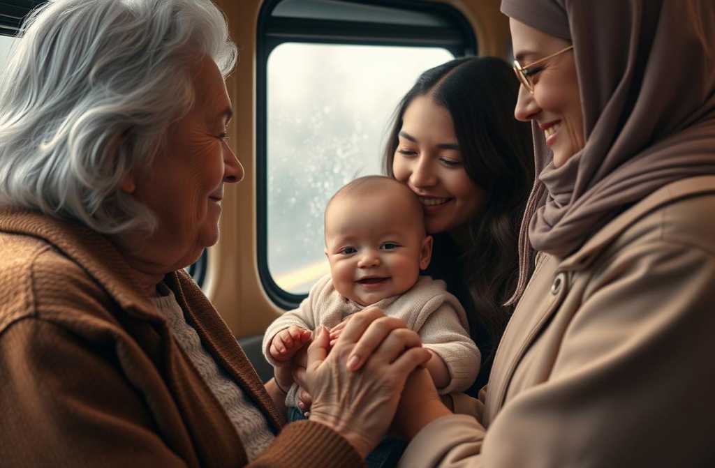 Moteris persidengė per saloną. Laisvų vietų nebuvo. Jaunas berniukas su ausinėmis sėdėjo, įsmeigęs žvilgsnį į telefoną. Šalia mergina rašė kažką, taip pat neatskeldama galvos. Salono vidury moteris su mažu vaiku ant rankų siūbuoja jį, niūniuodama lopšinę. Kūdikis verkšlendamas, o motina atrodė išsekusi.