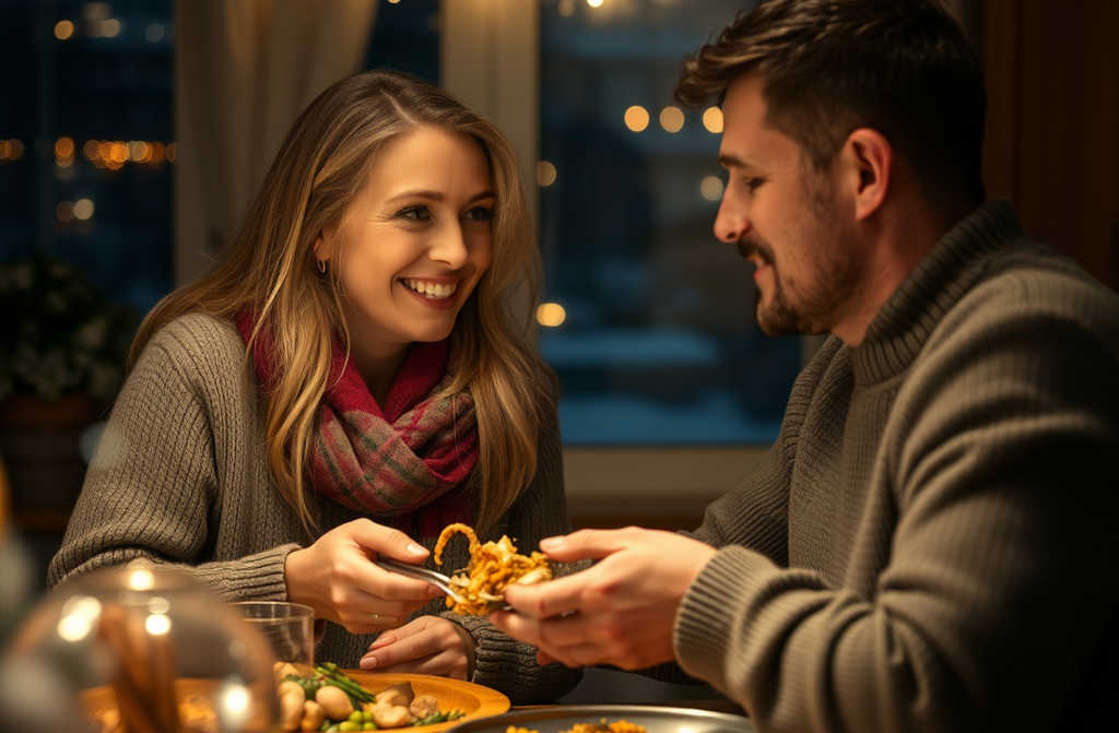 Po valandos jie jau sėdėjo prie naujai padengto stalo. Degė žvakės, skambėjo tylus džiazas. Antis su obuoliais buvo fantastiška su traškia plutele, sultinga ir kvapni.