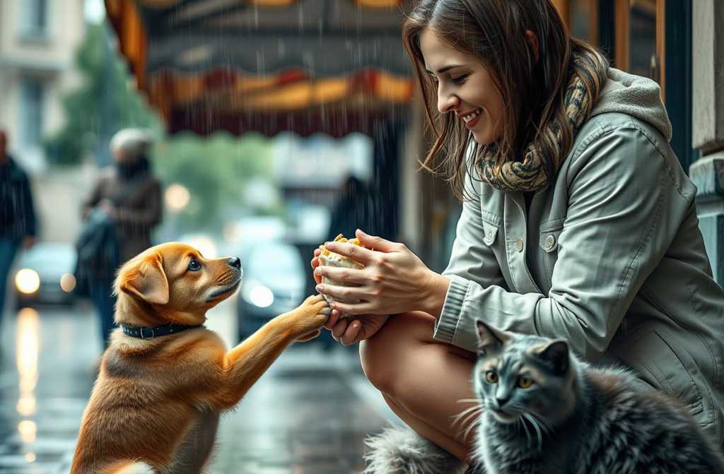 Moteris samdėsi į rankinę, ištraukė didelį sumuštinį su sūriu ir kumpiu. Kumpį padėjo šalia katės, o likutį priešais šuniuką. Pastarasis prisiglaudė prie asfalto ir susiraukė.