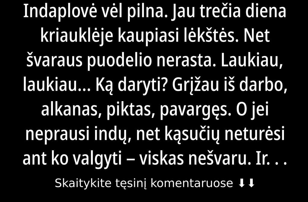 Ir valgyti nėra ką. Įjungiau virdulį, supyliau vandenį į puodą ir pastačiau ant viryklės. Gal bent dešreles išsivirsiu. Ar išvirtas bulves. Viskas jau taip buvo… Niekada nemaniau, kad taip teks kentėti. O kokia rasolynė buvo iš Marijos! Norėčiau tokios sriubos dabar…
