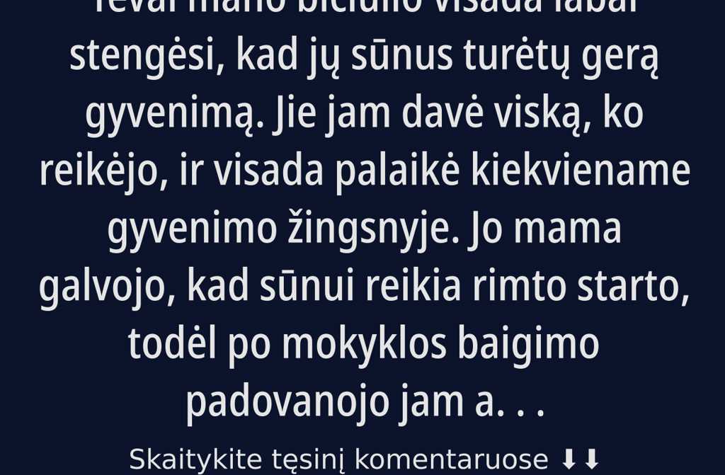 Tėvai mano bičiulio visada labai stengėsi, kad jų sūnus turėtų gerą gyvenimą. Jie jam davė viską, ko reikėjo, ir visada palaikė kiekviename gyvenimo žingsnyje. Jo mama galvojo, kad sūnui reikia rimto starto, todėl po mokyklos baigimo padovanojo jam automobilį, o kai įstojo į universitetą gerai sutvarkytą butą Vilniuje. Draugas visada buvo atsakingas, brangino tėvų patarimus ir nuolat jiems pasakodavo, kaip sekasi. Bet jo mama pradėjo nerimauti, kai sūnui sukako 27 metai o jis vis dar nerodė jokio susidomėjimo vedybomis.