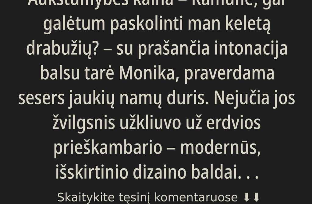 Nejučia jos žvilgsnis užkliuvo už erdvios prieškambario modernūs, išskirtinio dizaino baldai, veidrodžiai drožinėtuose rėmuose, tvarkingas minkštasuolis prie durų viskas čia atrodė taip, tarsi būtų nukopijuota iš žurnalo apie namų interjerą. Krūtinėje suspaudė seniai pažįstama, tačiau nesilpstanti pavydas: Ramunė visados turėjo viską idealiai.