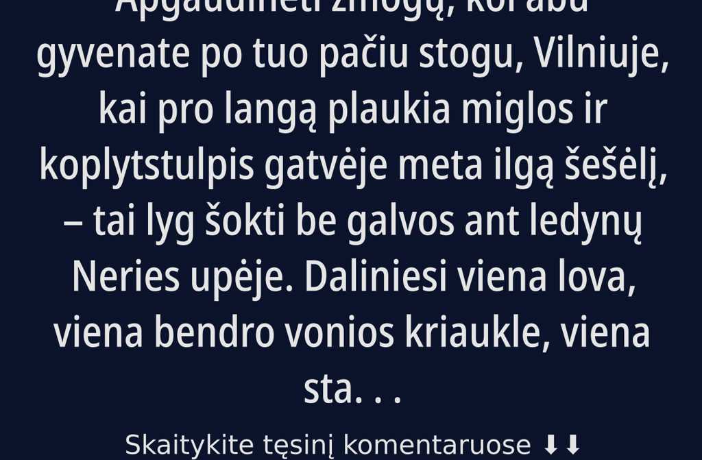 Apgaudinėti žmogų, kol abu gyvenate po tuo pačiu stogu, Vilniuje, kai pro langą plaukia miglos ir koplytstulpis gatvėje meta ilgą šešėlį, tai lyg šokti be galvos ant ledynų Neries upėje. Daliniesi viena lova, viena bendro vonios kriaukle, viena staline lempa, kurios šviesoje vakarais ji rašo tau žinutes į sapną, ir vis tiek surandi laiko pasiklysti svetimuose žodžiuose ar kažkieno svetimuose glėbiuose, o paskui grįžti į tuos pačius patalus, kurie dar kvepia žmogumi, kuriuo tu esi brangiausias. Čia ne tik išdavystė tai šalta, apgalvota nepagarba.