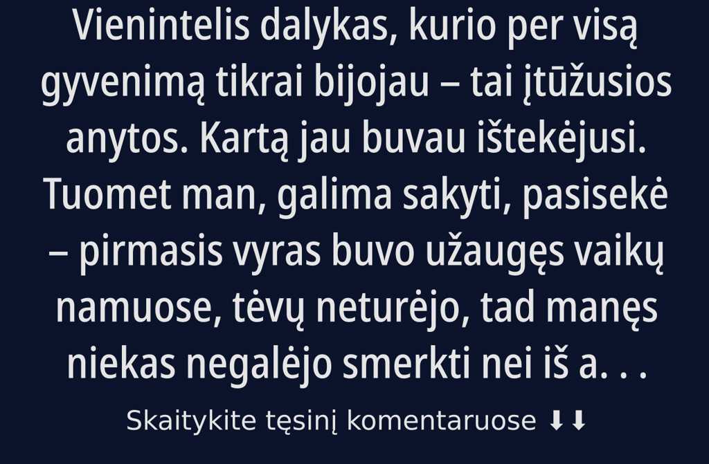 Vienintelis dalykas, kurio per visą gyvenimą tikrai bijojau tai įtūžusios anytos. Kartą jau buvau ištekėjusi. Tuomet man, galima sakyti, pasisekė pirmasis vyras buvo užaugęs vaikų namuose, tėvų neturėjo, tad manęs niekas negalėjo smerkti nei iš anapus, nei šiapus. Bet mūsų santuoka truko vos penkerius metus viskas subyrėjo. Kai susituokėme, dar mokiausi universitete. Vyras po metų pradėjo vartoti alkoholį, prisidarė skolų, o man, kaip žmonai, teko viską kartu tempti. Turėjau mesti mokslus, kad galėčiau dirbti ir grąžinti jo skolas litais.