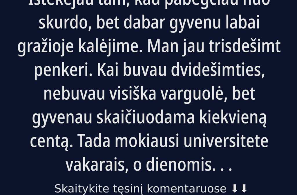 Kartais pagalvoju, kas būtų, jei būčiau likusi viena, jei būčiau baigusi mokslus be trumpų kelių, jei būčiau laukusi kitos meilės. Kartais jaučiuosi kalta net už šias mintis, nes yra moterų, kurios atiduotų viską už tokią stabilumą. Ir štai tada atsiranda kaltė: neturiu teisės skųstis, bet negaliu ir meluoti sau.