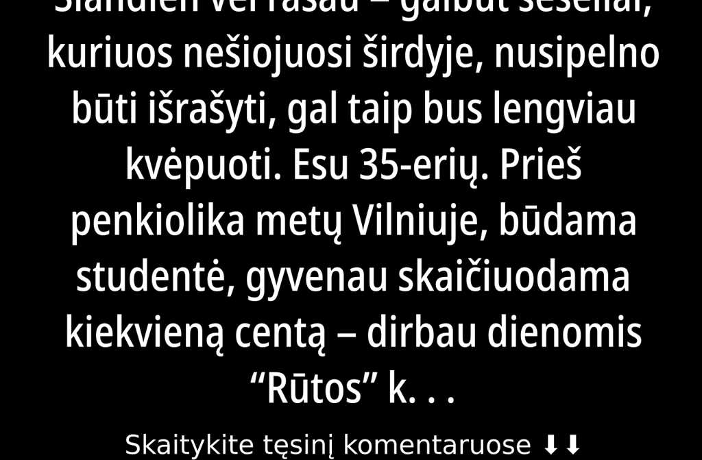 Esu 35-erių. Prieš penkiolika metų Vilniuje, būdama studentė, gyvenau skaičiuodama kiekvieną centą dirbau dienomis Rūtos kepyklėlėje, o vakarais traukiau į paskaitas universitete. Grįždavau pavargusi, su perštinčiomis kojomis ir mintimis, ar šį mėnesį pakaks pinigų autobusui, maistui, dokumentų kopijoms ir mokesčiams. Svajojau ne apie prabangą, o apie paprastą ramybę stabilumą, kai nereikia nuolat lyg žiurkė bėgti, kad neiškristum iš rato.