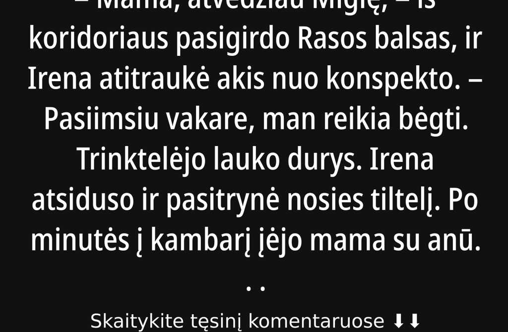 Mama, atvedžiau Miglę, iš koridoriaus pasigirdo Rasos balsas, ir Irena atitraukė akis nuo konspekto. Pasiimsiu vakare, man reikia bėgti.