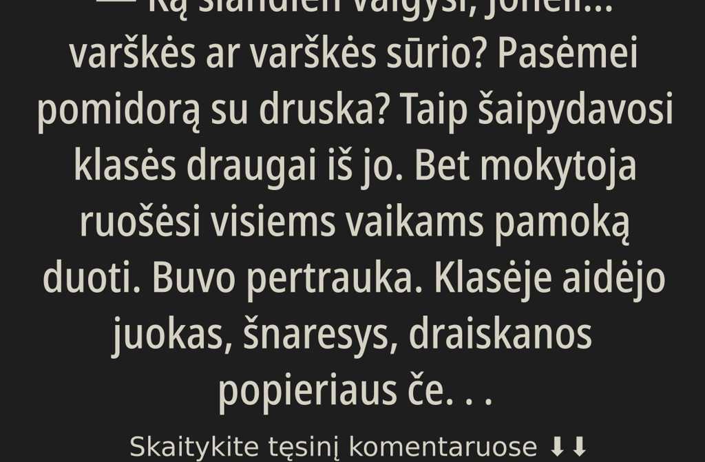 Ką šiandien valgysi, Joneli varškės ar varškės sūrio? Pasėmei pomidorą su druska? Taip šaipydavosi klasės draugai iš jo.
