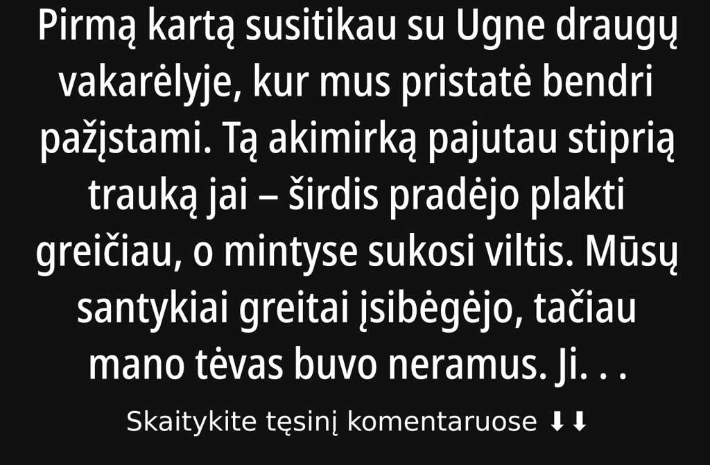 Pirmą kartą susitikau su Ugne draugų vakarėlyje, kur mus pristatė bendri pažįstami. Tą akimirką pajutau stiprią trauką jai širdis pradėjo plakti greičiau, o mintyse sukosi viltis. Mūsų santykiai greitai įsibėgėjo, tačiau mano tėvas buvo neramus. Jis mane perspėjo, kad Ugnė galbūt nėra nuoširdi gal jai rūpi tik pinigai ar turtas. Man šis įtarimas nepatiko, netgi šiek tiek supykau, nes jai net nebuvau papasakojęs apie mūsų šeimos finansinę padėtį. Tėvas visgi paragino kuo ilgiau laikyti šią informaciją paslaptyje, kad galėčiau suprasti, ar Ugnės jausmai yra tikri.
