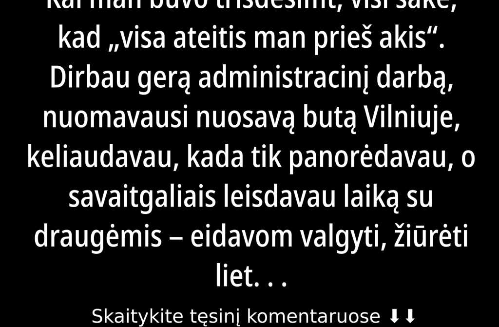 Kai man buvo trisdešimt, visi sakė, kad visa ateitis man prieš akis. Dirbau gerą administracinį darbą, nuomavausi nuosavą butą Vilniuje, keliaudavau, kada tik panorėdavau, o savaitgaliais leisdavau laiką su draugėmis eidavom valgyti, žiūrėti lietuviškų filmų, kartais šokti klube.