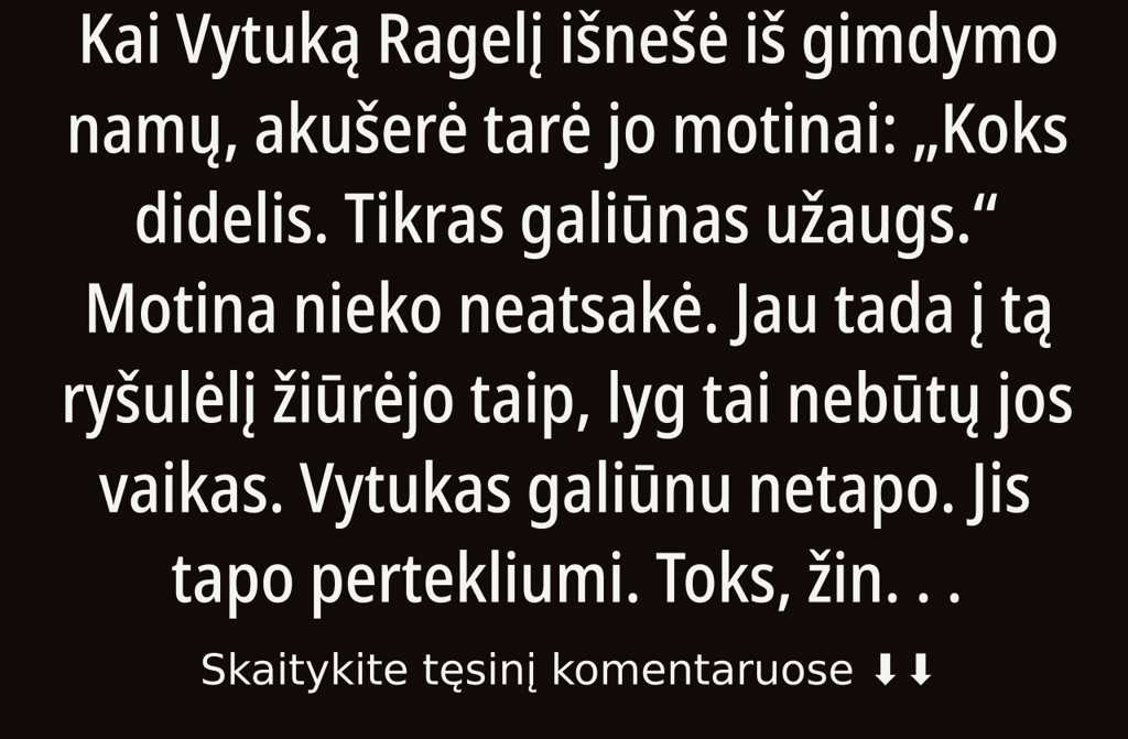 Štai, ištiesė voką. Čia dešimt tūkstančių eurų. Viskas, ką sukaupiau. Pradžiai užteks, jei protingai išleisi. Ir atmink niekam nieko neprivalai. Tik sau. Tapk žmogum, Vytautai. Ne dėl manęs. Dėl savęs.
