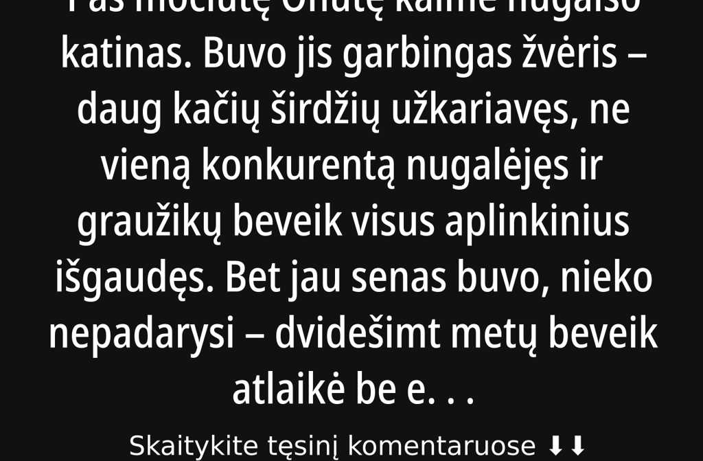 Pas močiutę Onutę kaime nugaišo katinas. Buvo jis garbingas žvėris daug kačių širdžių užkariavęs, ne vieną konkurentą nugalėjęs ir graužikų beveik visus aplinkinius išgaudęs. Bet jau senas buvo, nieko nepadarysi dvidešimt metų beveik atlaikė be esminių remontų.