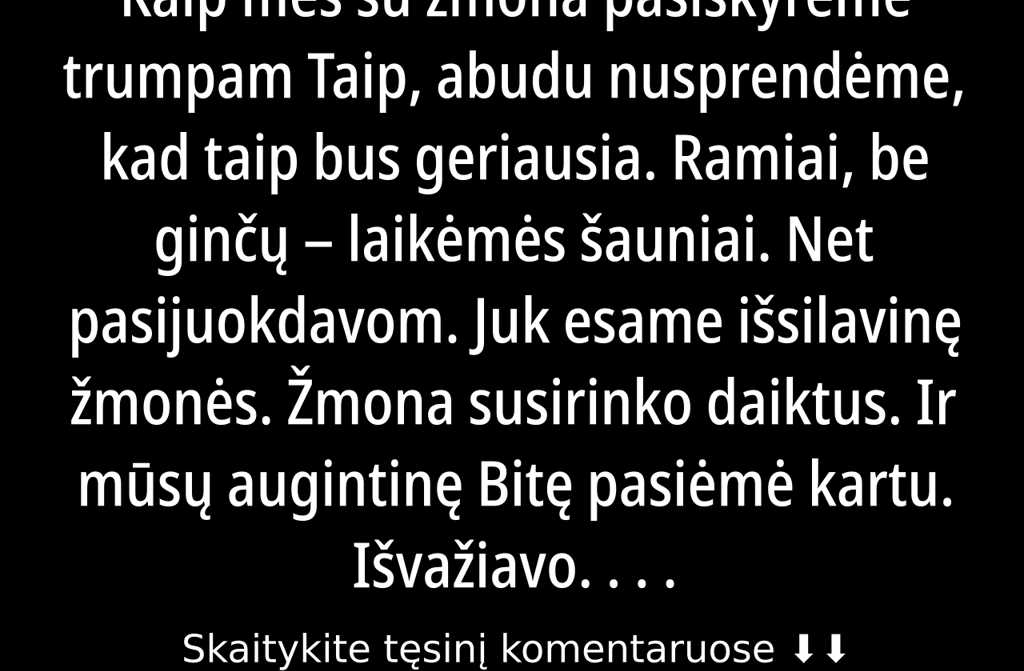 Taip, abudu nusprendėme, kad taip bus geriausia. Ramiai, be ginčų laikėmės šauniai. Net pasijuokdavom. Juk esame išsilavinę žmonės.