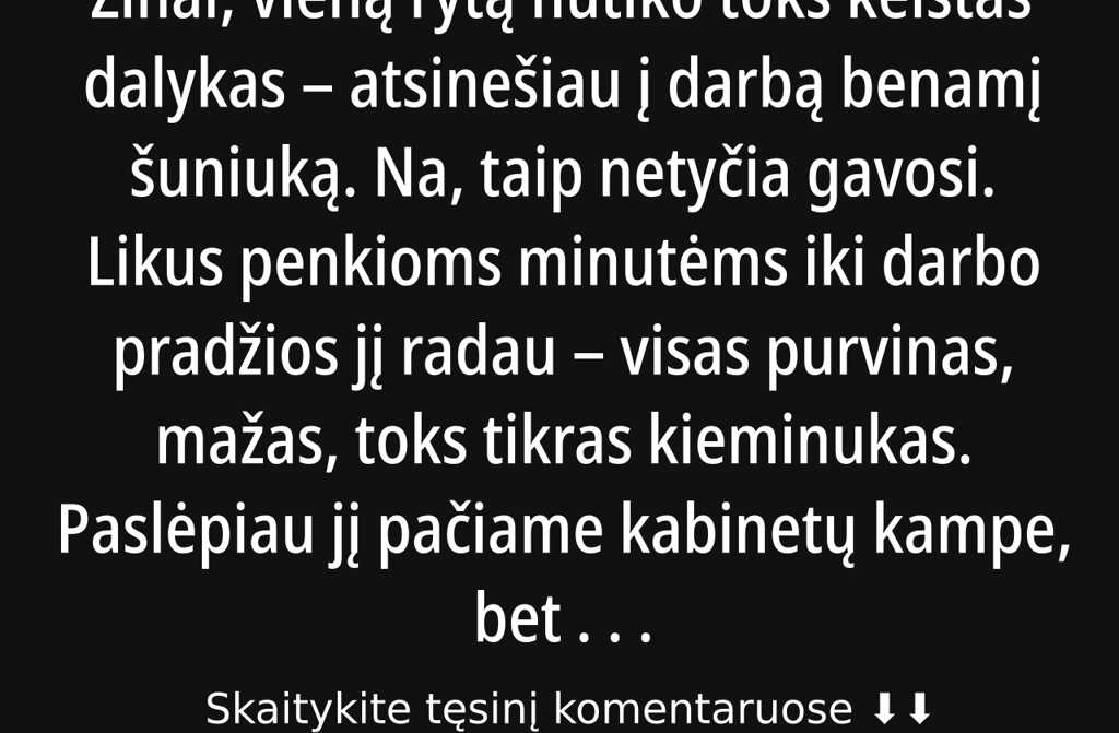 Žinai, vieną rytą nutiko toks keistas dalykas atsinešiau į darbą benamį šuniuką. Na, taip netyčia gavosi. Likus penkioms minutėms iki darbo pradžios jį radau visas purvinas, mažas, toks tikras kieminukas. Paslėpiau jį pačiame kabinetų kampe, bet tas padarėlis vis lįsdavo lauk ir cypteldavo. Aišku, galop jį pamatė visi kolegos.
