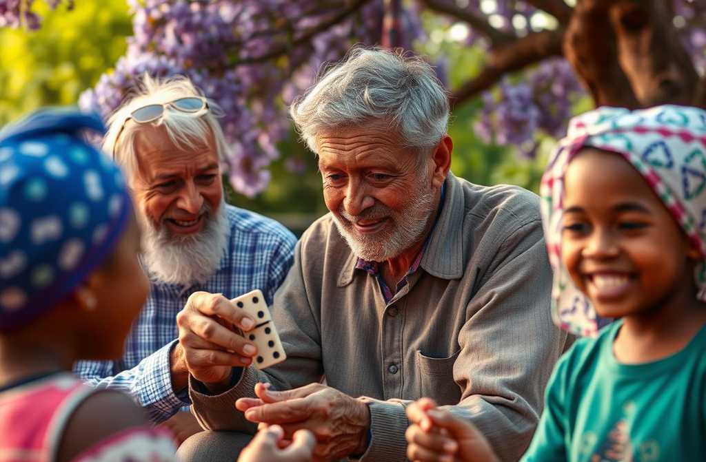 Senis su šiaudine skrybėle ir lazda jų žaidimų viduryje.