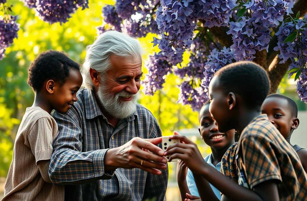 Senis su šiaudine skrybėle ir lazda, besiteršiantis jų žaidimams.