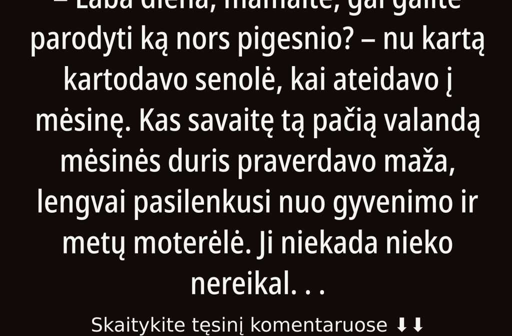 Mėsininkas žiūrėjo į ją ir jautė, kaip akys pradeda rasoti. Tą dieną mėsinėje buvo parduota ne tik mėsa, bet ir žmogiškumas. Pasidalinta viltimi. Gal pasaulio nesutvarkysi gražiais šūkiais, bet pakeist gali mažom širdies dovanom. Viena papildoma maišelio dalimi. Vienu paprastu gestu. Vienu žvilgsniu, kuris sako: