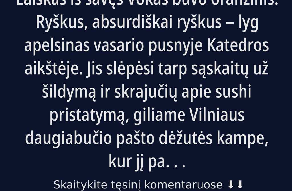 Vokas buvo oranžinis. Ryškus, absurdiškai ryškus lyg apelsinas vasario pusnyje Katedros aikštėje. Jis slėpėsi tarp sąskaitų už šildymą ir skrajučių apie sushi pristatymą, giliame Vilniaus daugiabučio pašto dėžutės kampe, kur jį paskutinį ištraukė Rimgailė.