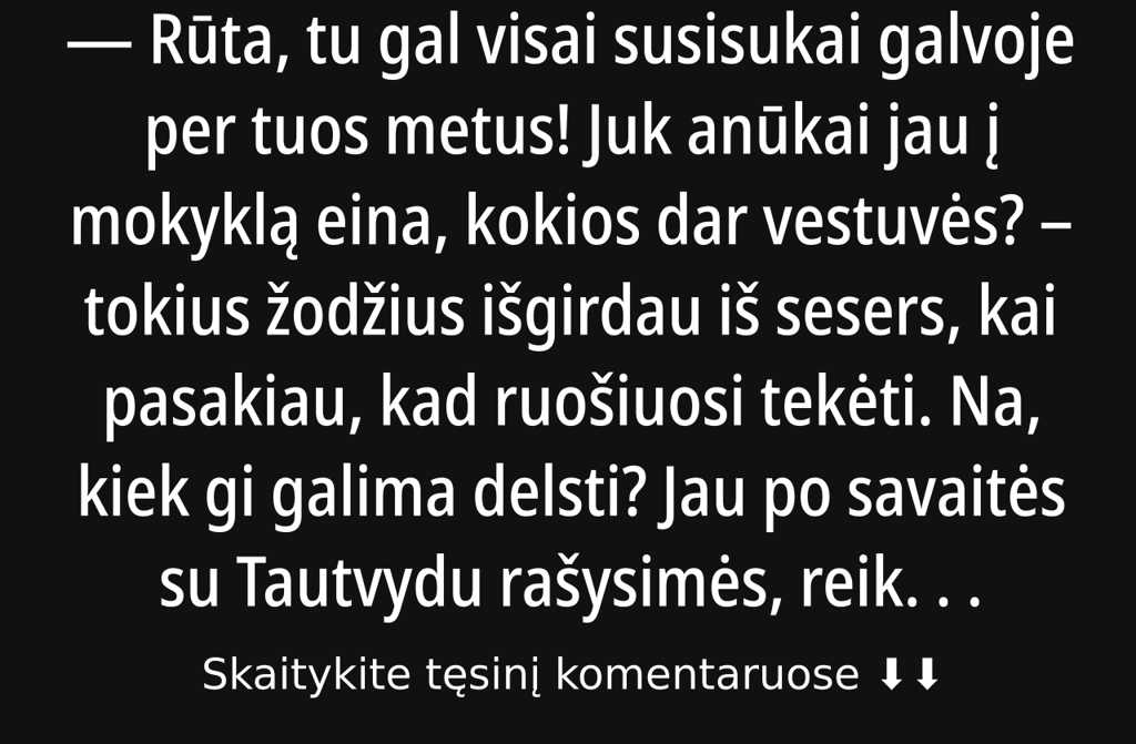 Rūta, tu gal visai susisukai galvoje per tuos metus! Juk anūkai jau į mokyklą eina, kokios dar vestuvės? tokius žodžius išgirdau iš sesers, kai pasakiau, kad ruošiuosi tekėti. Na, kiek gi galima delsti? Jau po savaitės su Tautvydu rašysimės, reikia gi kažkaip žinią iki sesės nugabenti, galvojau. Aišku, į šventę ji neatvažiuos gyvenam skirtinguose Lietuvos kampuose. Ir šiaip, gražių baliausų su šūksniais būkite laimingi! organizuoti per šešiasdešimt nesinori ramiai pasirašysim ir dviese paminėsim.