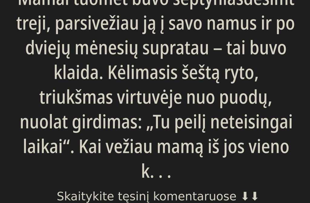 Mama apsigyveno ir iškart pradėjo kurtis savoje erdvėje. Atidavėm jai didžiausią kambarį, nupirkom naują ortopedinį čiužinį, pastatėm mėgstamą krėslą prie lango. Ji vaikščiojo po butą, glostė sienas, šypsojosi ir vis kartojo: Kaip gera būti kartu su jumis.