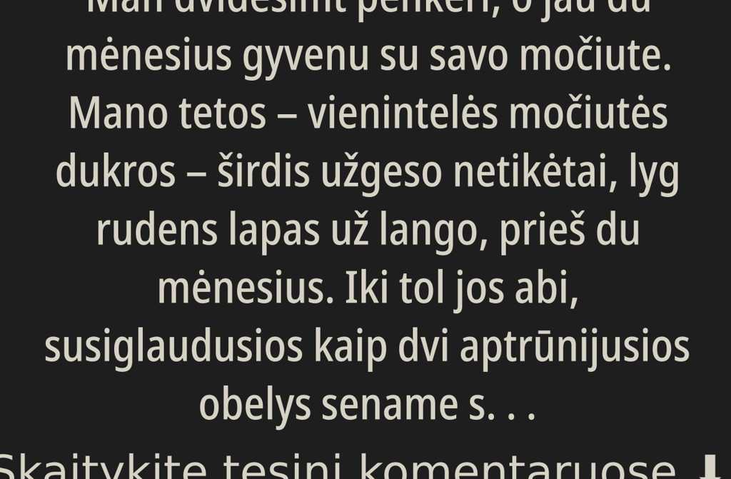 Pirmos dienos po laidotuvių praplaukė keistai, lyg vaikiškas sapnas. Močiutė vaitojo ne garsiai, bet jos skausmas pasiliųpdavo į smulkius įpročius ji sėdo prie stalo tyliai, pamiršdavo išjungti šviesas, kartais tiesiog stovėdavo tuščioje virtuvėje, lyg pro šalį eitų anapusiniai. Sakiau sau: būsiu tik kelias dienas. Dienos išsitęsė į savaitgalį, tada į savaites. Vieną rytą apžiūrinėjau savo dėžes spintoje ir supratau jau nebeišeisiu.