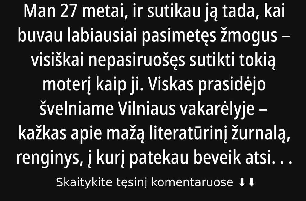 Man 27 metai, ir sutikau ją tada, kai buvau labiausiai pasimetęs žmogus visiškai nepasiruošęs sutikti tokią moterį kaip ji. Viskas prasidėjo švelniame Vilniaus vakarėlyje kažkas apie mažą literatūrinį žurnalą, renginys, į kurį patekau beveik atsitiktinai. Bičiulis prašė palydėti, padėti panešti dėžes, o man pinigai buvo sugriežėjusi realybė trūko eurų, tad sutikau.