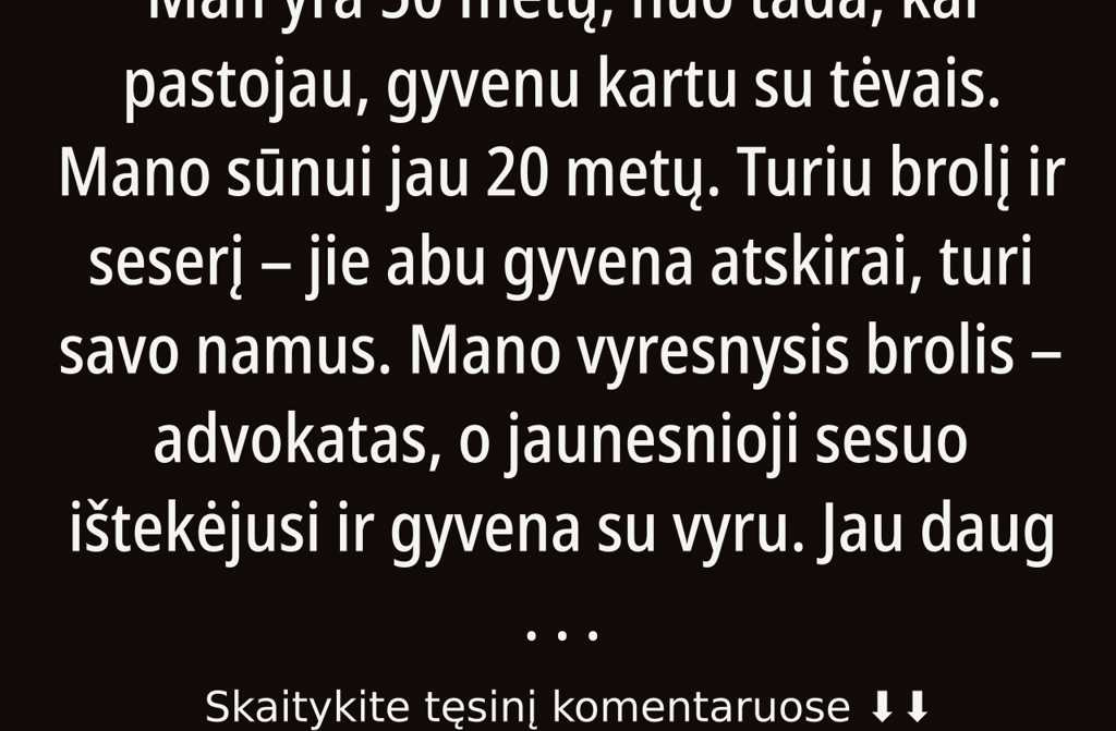 Man penkiasdešimt, o vis dar gyvenu su tėvais nuo tada, kai pastojau. Mano sūnui jau dvidešimt. Turiu vyresnį brolį ir jaunesnę seserį abu jie gyvena savo namuose. Brolis, Mindaugas, yra žinomas advokatas, o sesuo, Daiva, ištekėjusi ir su vyru gyvenanti Kaune. Jau daugelį metų mano pajamos leistų įsigyti nuosavą būstą ar net nupirkti tėvo namą. Ir taip, bandžiau ne kartą jau kalbėjom apie tai, bet vis išeina, kad dėl dokumentų ar kitų niuansų reikalai užstringa. Mano vienintelė sąlyga jei nors ir nupirkčiau šiuos namus, jie liktų registruoti tėčio vardu iki paskutinės jo dienos, kad jis niekada nesijaustų paliktas ar nesaugus. Tačiau ir šiandien vis dar nepriėjome galutinio sprendimo.
