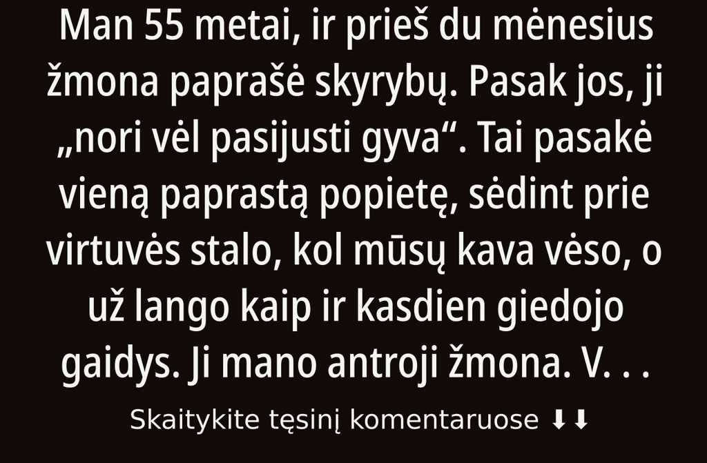 Man 55 metai, ir prieš du mėnesius žmona paprašė skyrybų. Pasak jos, ji nori vėl pasijusti gyva. Tai pasakė vieną paprastą popietę, sėdint prie virtuvės stalo, kol mūsų kava vėso, o už lango kaip ir kasdien giedojo gaidys.