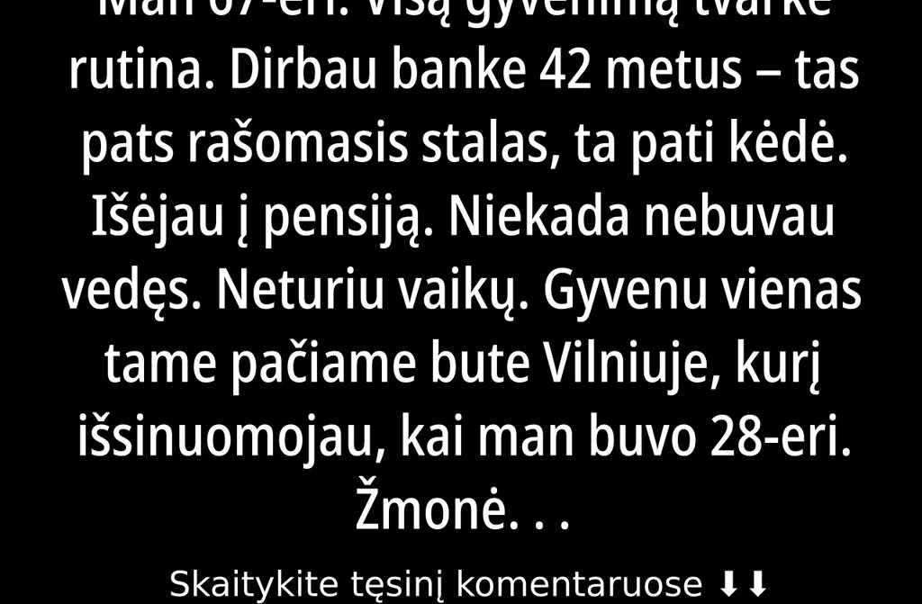 Man 67-eri. Visą gyvenimą tvarkė rutina. Dirbau banke 42 metus tas pats rašomasis stalas, ta pati kėdė. Išėjau į pensiją. Niekada nebuvau vedęs. Neturiu vaikų. Gyvenu vienas tame pačiame bute Vilniuje, kurį išsinuomojau, kai man buvo 28-eri.