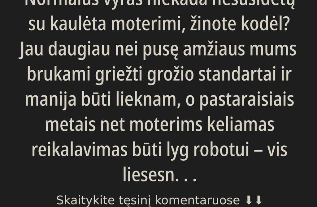 Jau daugiau nei pusę amžiaus mums brukami griežti grožio standartai ir manija būti lieknam, o pastaraisiais metais net moterims keliamas reikalavimas būti lyg robotui vis liesesnei ir liesesnei. Nori tu to ar ne, turi prisitaikyti prie visuomenės normų, tarsi būtum ne žmogus, o pudelis. Kitu atveju tavo neskatins darbe arba šalia neturėsi nė vieno padoresnio vyro.