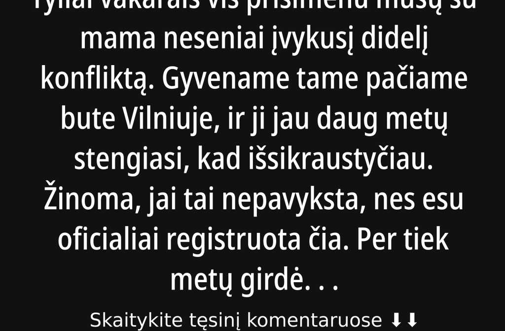 Tyliai vakarais vis prisimenu mūsų su mama neseniai įvykusį didelį konfliktą. Gyvename tame pačiame bute Vilniuje, ir ji jau daug metų stengiasi, kad išsikraustyčiau. Žinoma, jai tai nepavyksta, nes esu oficialiai registruota čia. Per tiek metų girdėjau įvairių argumentų, ir visada norėjau išlaikyti gerus santykius su artimiausiais žmonėmis.